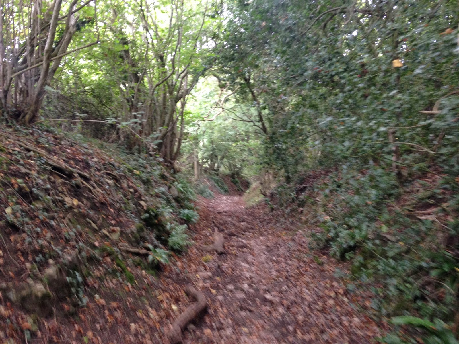 Step 3: After 10 minutes along the flat woody path, the path turns down the hill, slightly to the right.