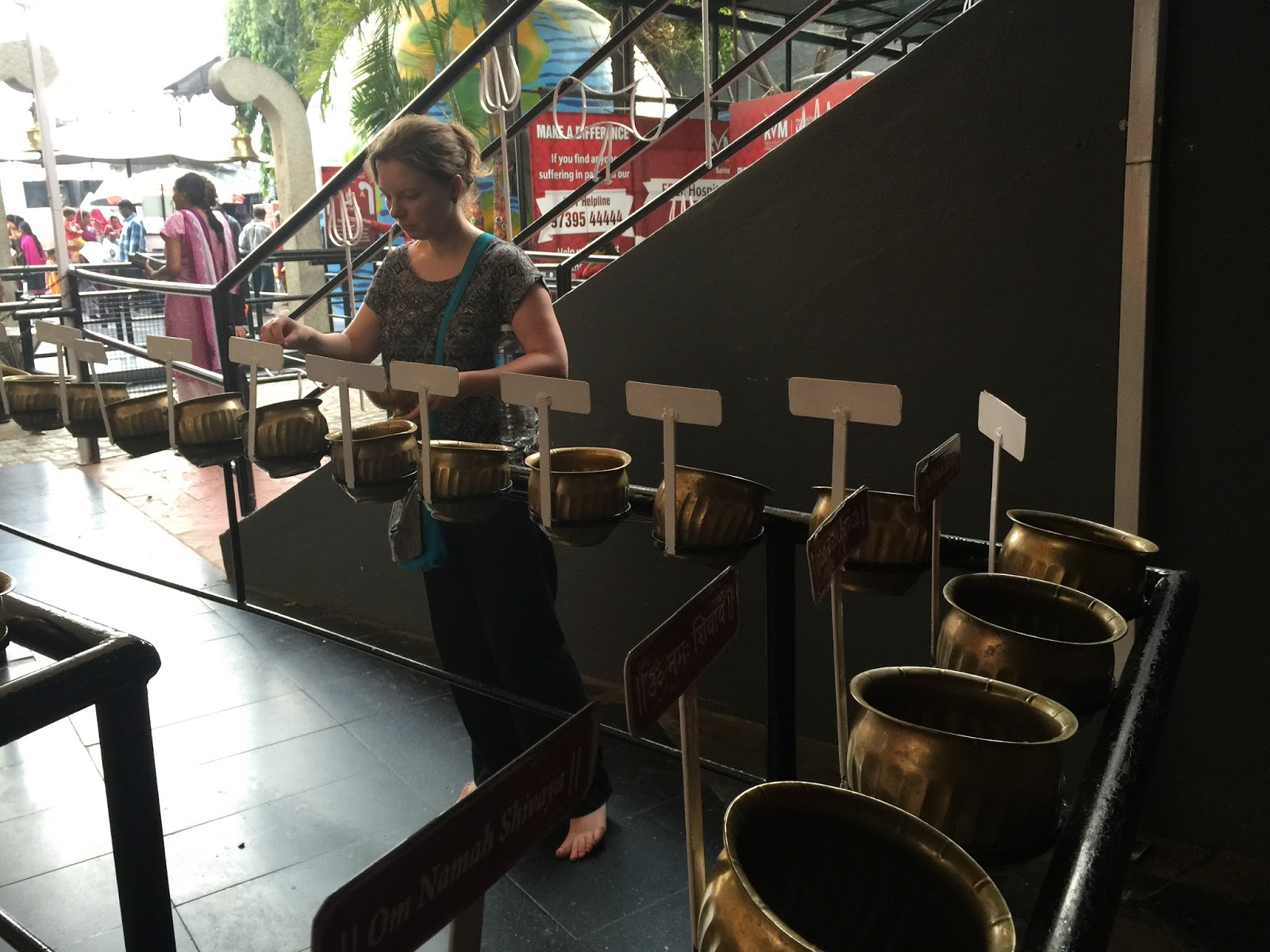 Next we tied our saffron coloured thread near the Lord Ganesha statue to ask him to look after our problems and went through another grotto-like tunnel, which was adorned with statues and explanations of who each of them were. We came back out into the main temple area, where we were invited to pour coconut milk on the sacred ‘Shiv Linga’ – a phallic looking stone carving, which is used in temples as a representation of Shiva.
